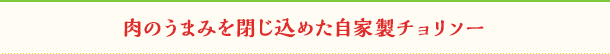 チョリソーと聞くと、つい辛いソーセージを思い浮かべますが、これはメキシコの唐辛子入りソーセージが、たまたま日本では「チョリソー」として定着してしまったため。本来は、スペイン語でソーセージ全般を指す言葉です。チョリパンのチョリソーは、牛肉をふんだんに使った極太の腸詰で、辛さはありません。ボイルや燻製はしないで、生のまま熟成させてから焼くのが特長です。