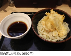 そしてもうひとつ、『鶏肉天つけうどん』は、いわゆる「鶏天」とはまた違う、フリッターに近い鶏肉の天ぷらが特徴の逸品です。