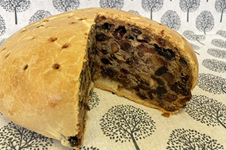 公現祭を祝って食べられていたというパンで、現在は大晦日に食べられているパンです。扇形に切って食べられています。生地はシンプルな配合ですが、ドライフルーツ、ナッツが沢山入り、スパイスの効いたパンです。