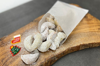 ドイツのクリスマス菓子であるバニラキプフェルをアレンジした、軽くホロホロと崩れるような食感が特徴のクッキーです。クリスマスを意識して、ピスタチオ(緑)とクランベリー(赤)に仕上げました。